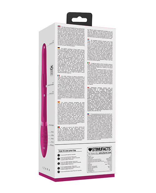 The IZARA, triple-action, beaded G-spot rabbit vibrator, has a 10 function, 360 degree multi directional rotating, non-jamming shaft, packed with 5 rows of beads. It also boasts a 10 function vibrating G-spot and 10 function clitoral vibrators. The IZARA most certainly packs a passionate punch. The 3 motors will give you over 1,000 possible unique settings to play with. Made from 100% silky smooth, medical grade silicone, it's 100% waterproof (ipx7), and extremely quiet at under 60db, which means you can use it wherever your heart desires. It contains a USB magnetic rechargeable lithium-ion battery, that when fully charged with its USB cable, will provide 50 minutes of passionate playtime. Just plug and charge! When you're getting close to climax, just one-touch of the special function climax button will immediately bring all the motors to full power/speed and, more importantly, bring you to an earth-shattering orgasm.