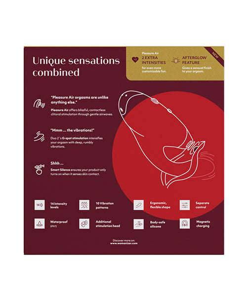 Dual Stimulation - DUO 2 simultaneously targets the G-spot with deep rumbly vibrations and the clitoris with suction-like Pleasure Air stimulation, creating satisfying blended orgasms.