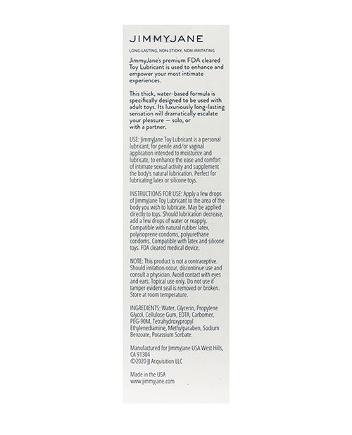 JimmyJane's premium FDA cleared Toy Lubricant is used to enhance and empower your most intimate experiences. This thick, water-based formula is specifically designed to be used with adult toys. Its luxuriously long-lasting sensation will dramatically escalate your pleasure — solo, or with a partner.