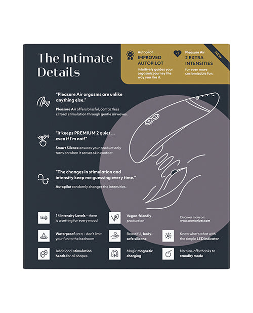 Womanizer PREMIUM 2 with the original Pleasure Air technology is our most luxurious creation yet - truly the Prada of sex toys, the ultimate toy for women who are looking for more than just another device to play with. With more intensity levels than ever before and an improved Autopilot function to take you on new, unpredictable adventures, PREMIUM 2 is the purest pleasure at the highest quality.